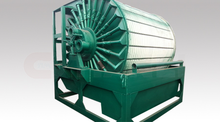 該機(jī)為上部給料的筒型外濾式真空永磁過濾機(jī),主要適用于對較粗顆粒強(qiáng)磁性物料的脫水。 筒體內(nèi)部裝有鍶鐵氧體永久磁系,可促使磁性顆粒迅速吸附到濾布表面,磁濾機(jī)主要用于粒度較粗的強(qiáng)磁性礦物精礦礦漿的脫水,由于是上部給料,使得濾餅中精礦按粒度分層的效果更加明顯,當(dāng)磁性精礦形成濾餅時(shí),顆粒同時(shí)受到重力和磁力的作用,粗顆粒精礦比細(xì)顆粒精礦向?yàn)V布運(yùn)動的快,精粒首先接觸濾布,故濾餅的透氣性好,而且礦漿中磁性顆粒在磁力吸引下呈放射狀布于圓筒表面,并由于磁系極性變化而產(chǎn)生磁攪動作用,這都成為濾餅易脫水的有利條件,使得濾餅厚且透氣性好,顯著地提高了生產(chǎn)率,與同規(guī)格的筒形真空過濾機(jī)相比,其效率提高三倍以上。